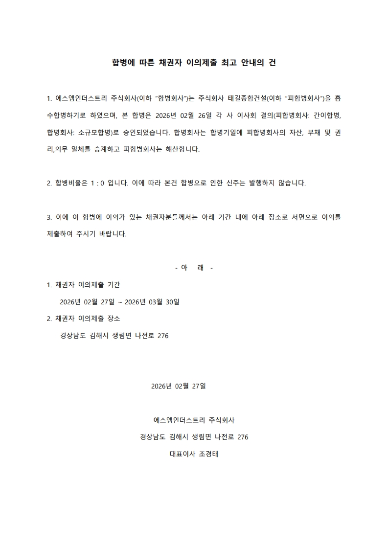 합병에 따른 채권자 이의제출 최고 안내의 건