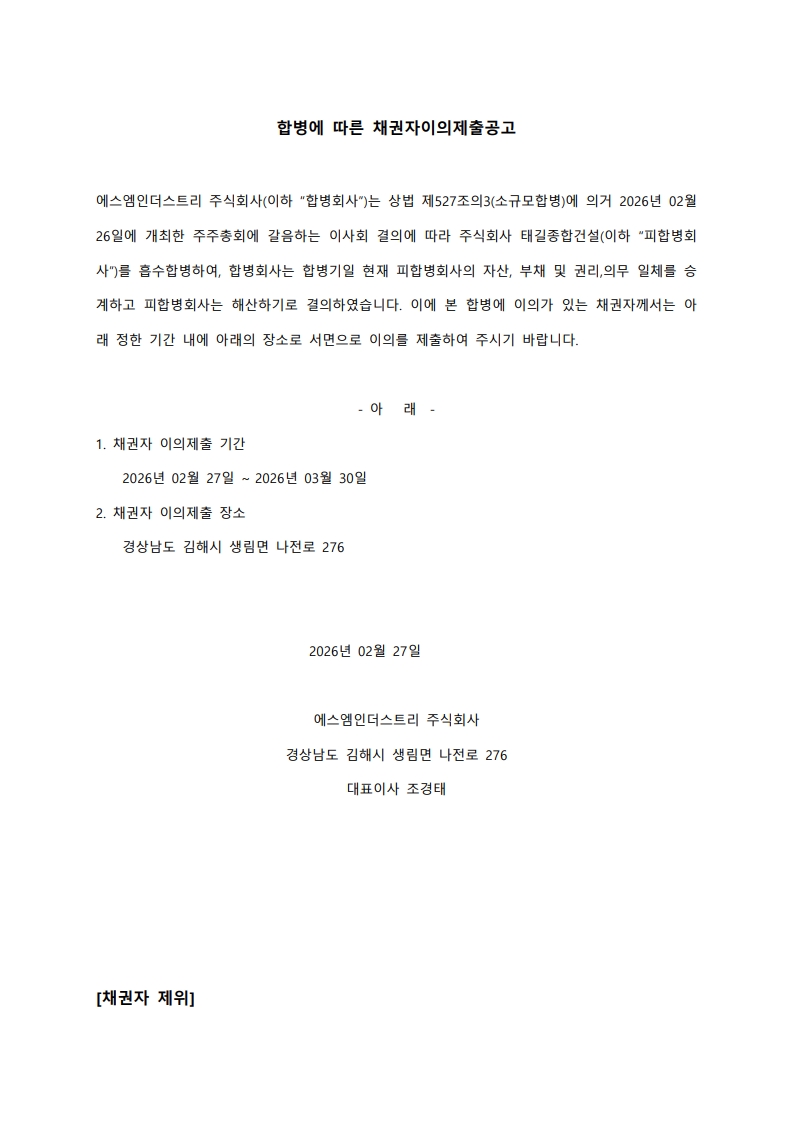 합병에 따른 채권자 이의제출 최고 안내의 건